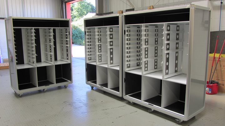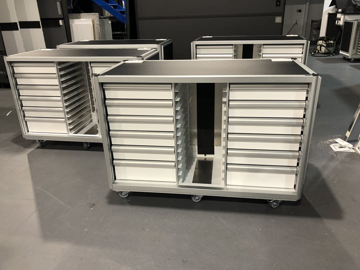 Quentor Framelight Storage units are an attractive, practical, and adaptable alternative to regular flightcases. Made with a sleek light-weight aluminium extruded frame and clean aluminium honeycomb side panels, Framelight Storage units have the look of contemporary interior storage furniture whilst maintaining many of the flexible mobility benefits of a flight case.