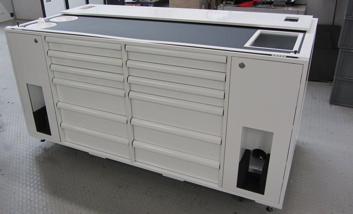 These highly desirable Garage Tool Cabinets present a bold statement of function and quality. Quentor has successfully supplied variations of these Garage Tool Cabinets to many elite motorsport Teams around the globe for over 30 years.