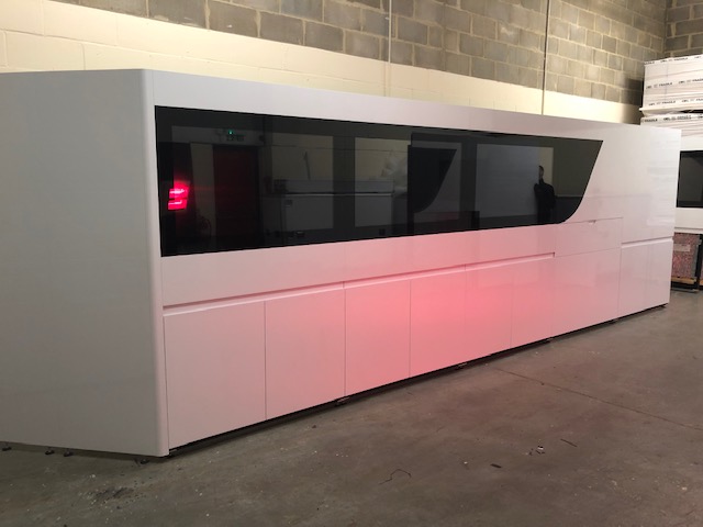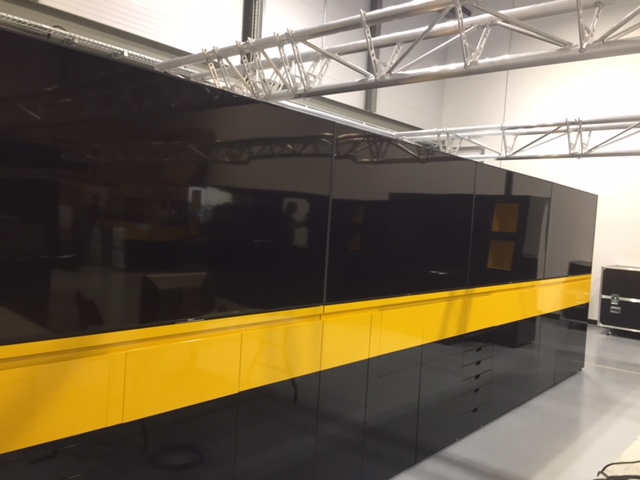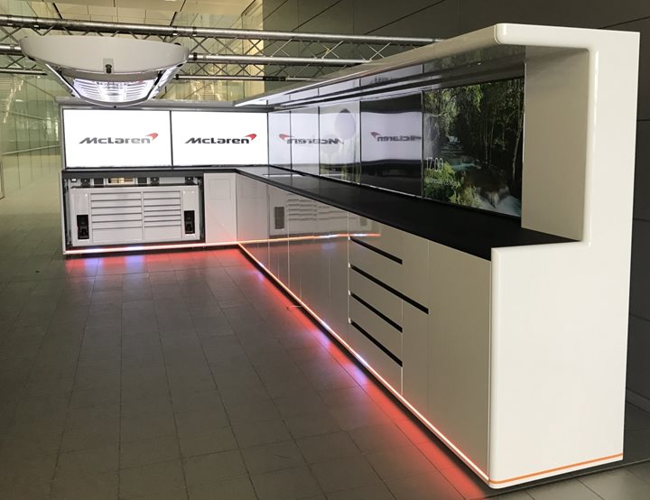 Integrated cupboard, shelf and drawer space in the lower half is ready to receive your race equipment. TV screens, light-up logos or graphic walls are mounted on the top half of the assembly to create a continuous display wall for your chosen marketing moving images or fixed graphics.