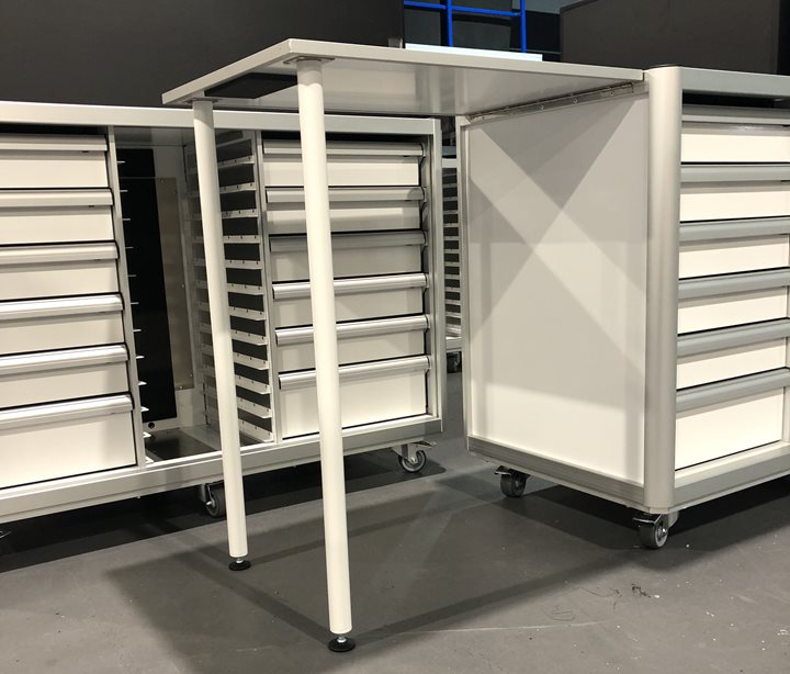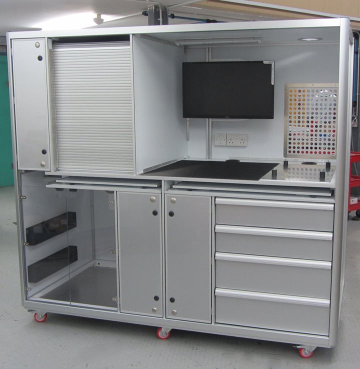 Framelight Storage units are easily transferred from your airfreight or truck transport to use inside your motorsport garage or factory environment so handling time is greatly reduced. Just remove a soft padded cover and you are ready to go.