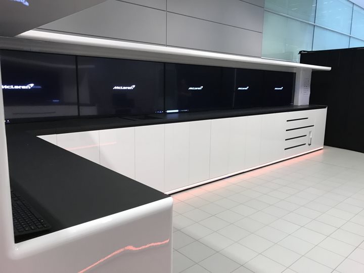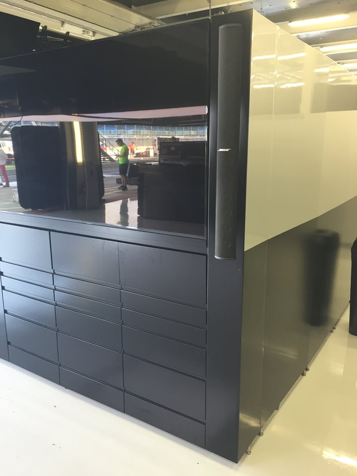Integrated cupboard, shelf and drawer space in the lower half is ready to receive your race equipment. TV screens, light-up logos or graphic walls are mounted on the top half of the assembly to create a continuous display wall for your chosen marketing moving images or fixed graphics.